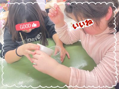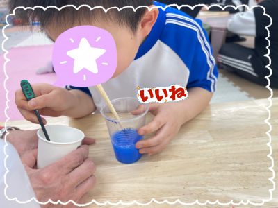 作り方を見ながら材料の確認、分量を量って混ぜて、ホウ砂水を加えながら硬さの調整をしみんな大好きスライムの完成です✨
