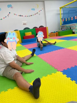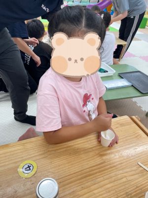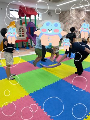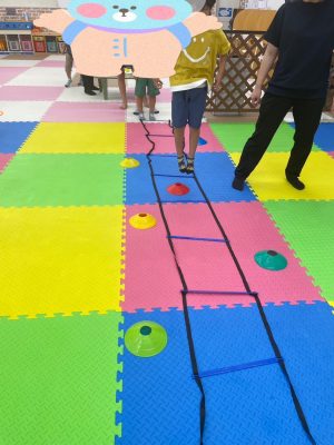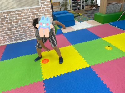 何色のコーンかよく聞いて素早くタッチするコーンタッチでは、ぐるぐる回っている子どももいましたが笑顔で取り組む様子が見られました😊